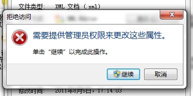 提示没有权利修改文件属性,用的是管理员登录的,还没有权限,哎,权限问题!同样,我们这时想编辑administrator权限把修改和写入权限加上去同样会弹出上面没有权限的提示!