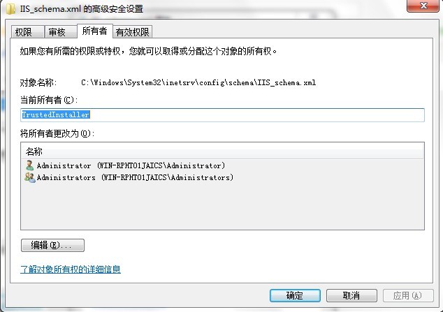 当前所有者是"TrustedInstaller",我们要把它改为“administrator”,单击“编辑”,选择“administrator”,单击“应用”,这时弹出一个对话框,如下图: