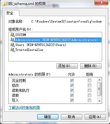 打开你系统盘(我是C盘),找到 C:\Windows\System32\inetsrv\config\schema目录,该目录下有一个IIS_schema.xml,右击打开文件,Ctrl+F,然后输入"