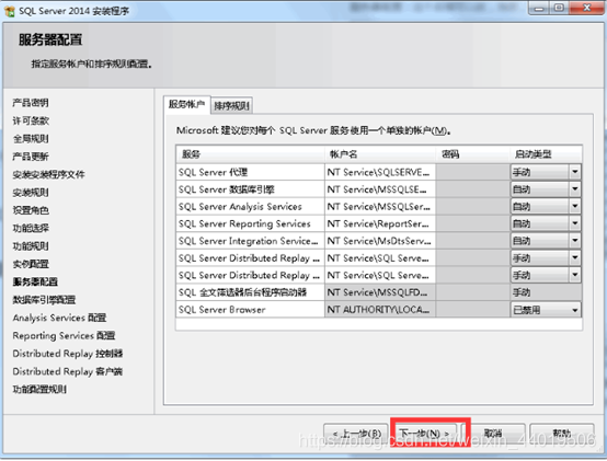 9.数据库的账号配置,这里配置成之前创建的账号MSSQL,由于使用本地账号的话,如果有其他服务器进行连接,不能连接。