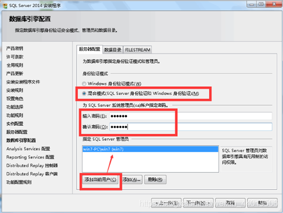 这里身份验证模式建议配成混合模式,sa账号密码要切记。另外指定SQL server管理员,建议添加MSSQL账号、一般安装SQL server会用administrator账号,也一并添加为管理员账号。
