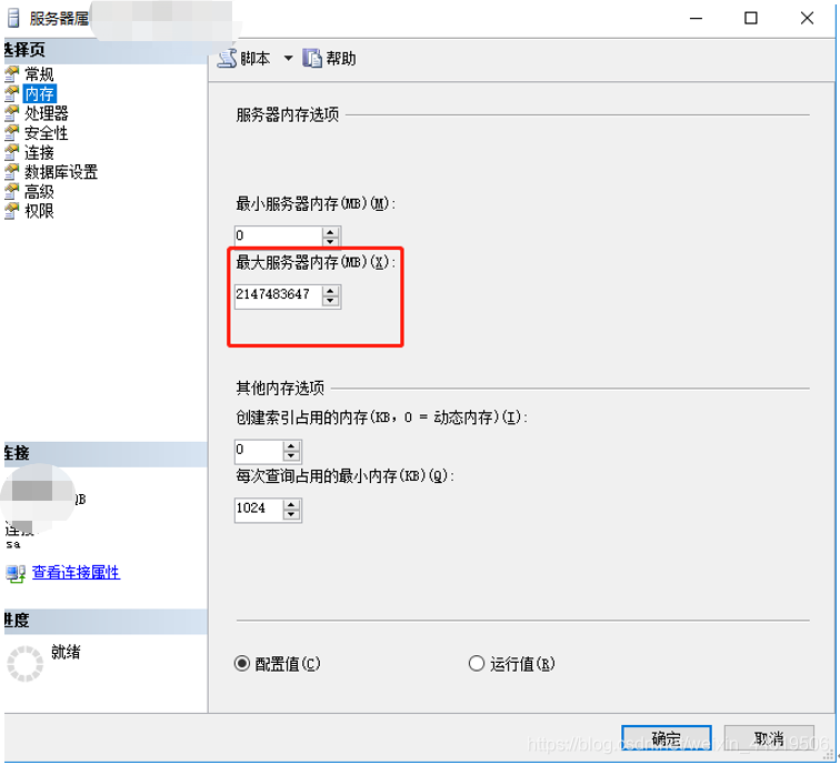 1.内存的配置,这里默认是最大值,若是数据库服务器的话,可以不必调整,以便于数据库能够最大内存的使用