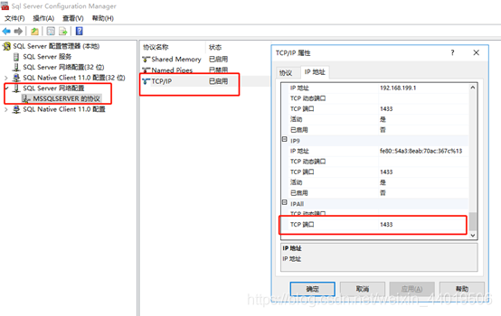 4.数据库的配置管理器端口号默认端口是1433,这里可以自行配置