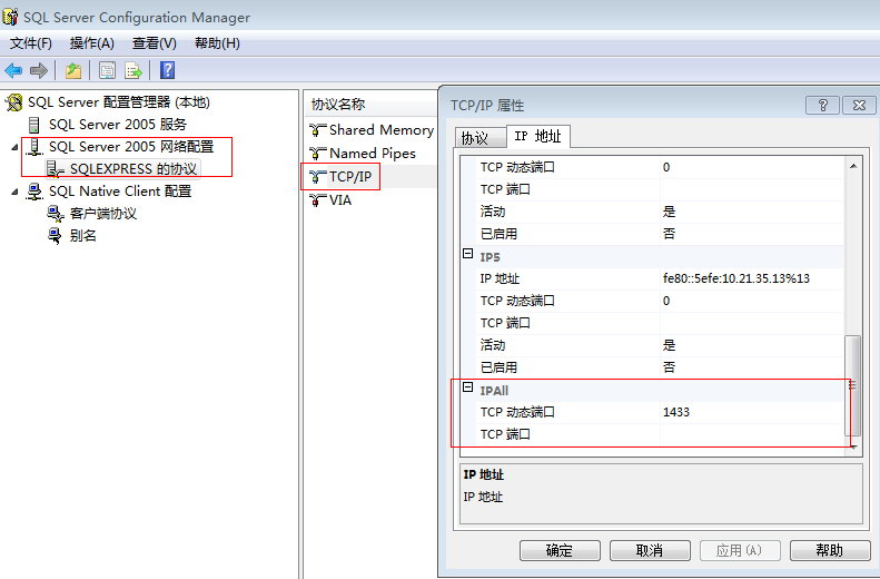 1)展开 SQL Server 2005/2008 网络配置节点-->展开协议节点--> 在协议右边启用 TCP/IP 协议 -->在协议右边的 TCP/IP 协议属性中 --> 在 IPAll 这一项-->将 TCP 端口设置为 1433,