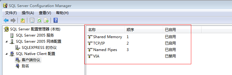 如图,有两个地方需要禁用。MSSQLSERVER的协议(或者是SQLEXPRESS的协议)和客户端协议里。然后在SQL Server 2005l里在重新启动就可以了。